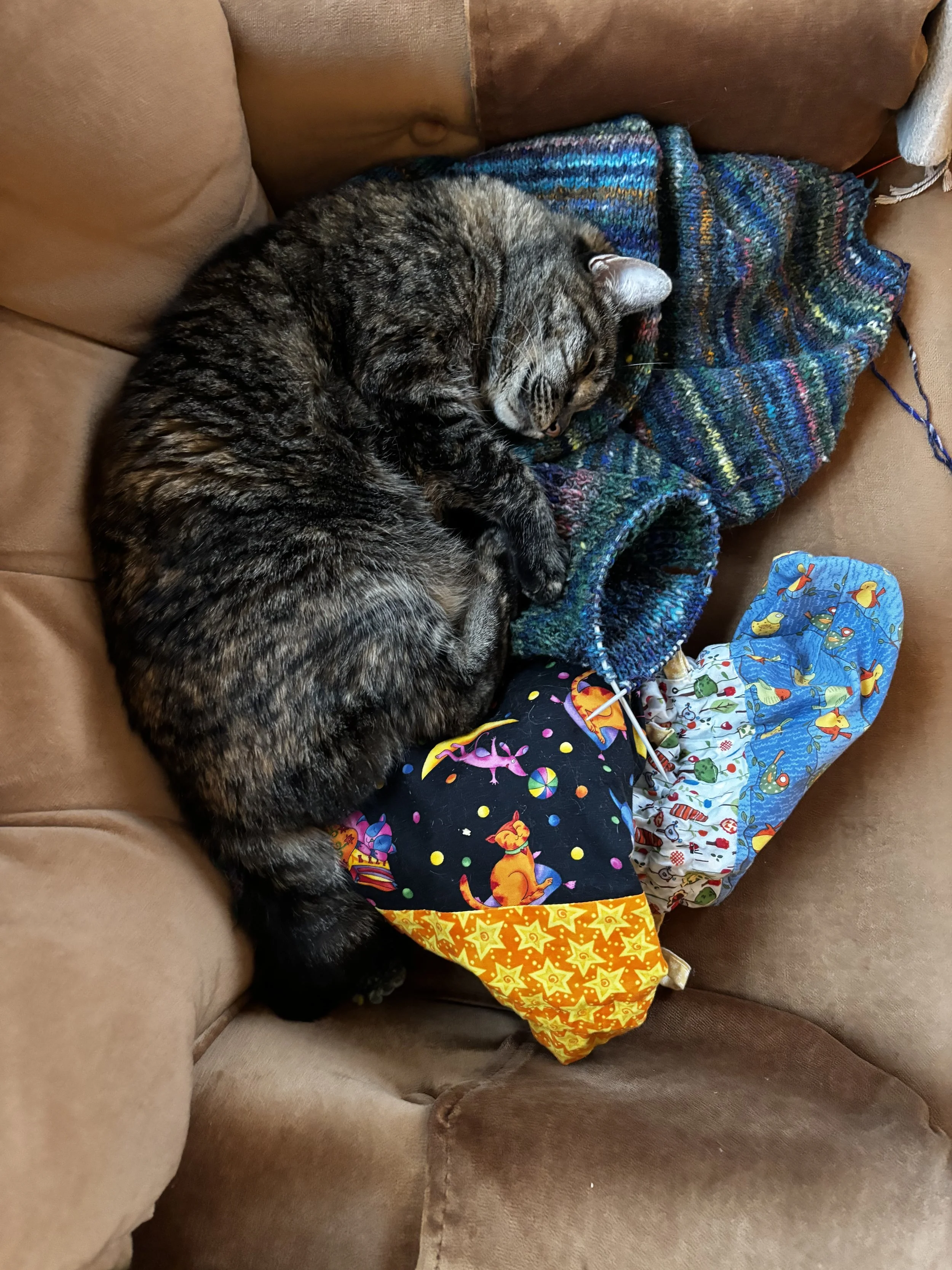 This is Xena who is currently choosing to take a nap on my knitting instead of in the bed we bought for her (see drawing above, the maroon “soft box” on the couch) or the many blankets left out for her perusal).