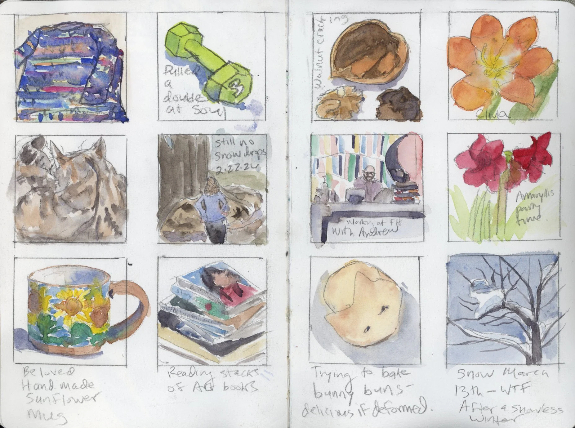 I have been following an artist online who has been making little square “diary” comics about her daily life and I found them fascinating and inspiring and decided to do a few of my own! I think I’d like to continue this. A little 2” x 2” square is totally manageable and I like how it makes me think of something interesting to document each day. As you can see, indoor flowering house plants are essential and there is high interest in what might be flowering outside!