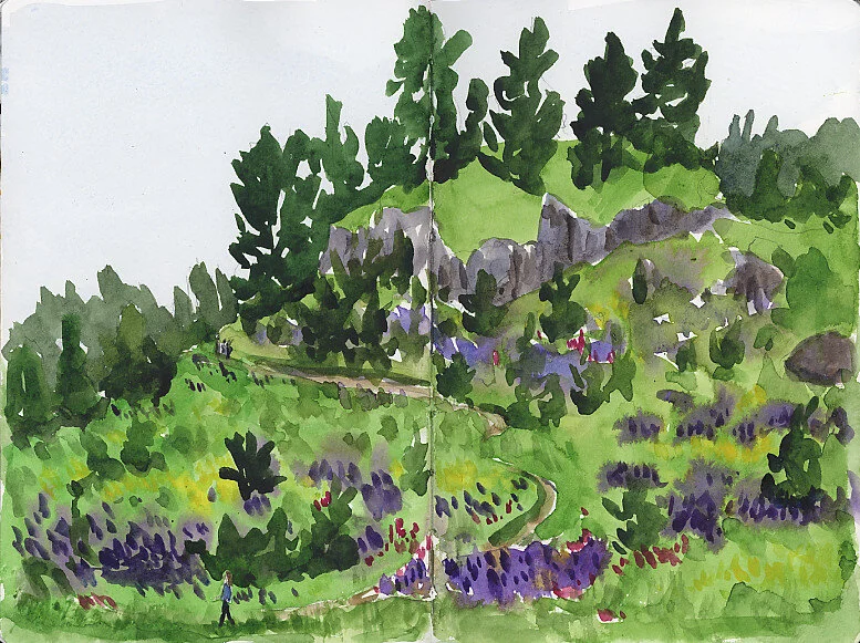 Hello again everyone! I hope you are doing well. I write this on the shortest day of the year as a constant rain slowly washes the snow off our lawn, but by the time you receive this, we’ll be on the other side, heading toward lengthening daylight. I wanted to wish you all well and thank you for coming along with me on my adventures. While it has been a wild ride out in the world, in my little sphere, I’ve gotten along quite well with lots of time spent in the garden and out painting on location and learning to use gouache. Loss of income due to the cancellation of art festivals and store and school closures was offset by people reaching out for private commissions so I feel very fortunate. My studio-to-be arrived in its raw state in late April and is still a mess inside, but I have hopes of getting in there before its 1 year anniversary-ah, home improvement projects. I’ve been talking with the Northwest Museum of Art and Culture and the Spokane Art School and we have plans to teach online via Zoom starting around March and I hope to also do Zoom classes out of my studio once it is finished. I’d love to hear your thoughts on what kind of classes you’d like to take from me on Zoom-a Paint & Sip class? Painting skies? Color theory?